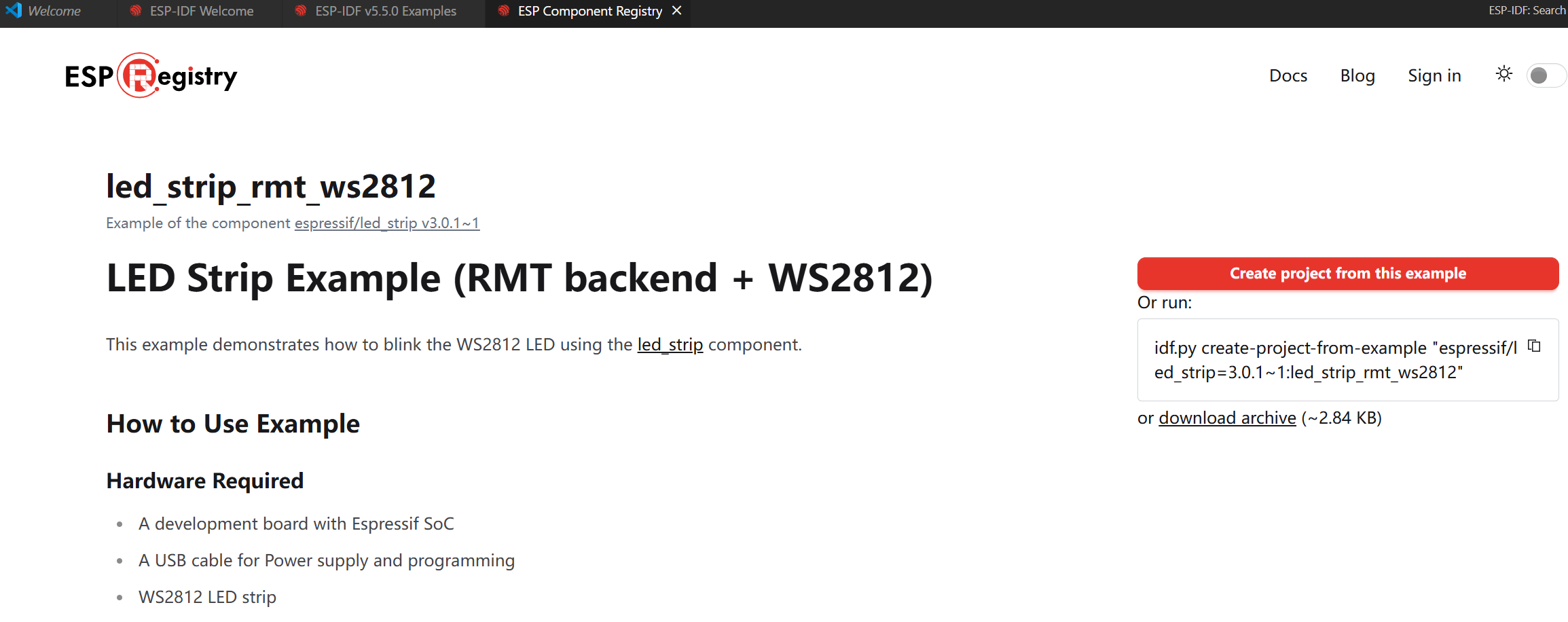 以ESP Component espressif/led_strip组件的example为工程进行实践。