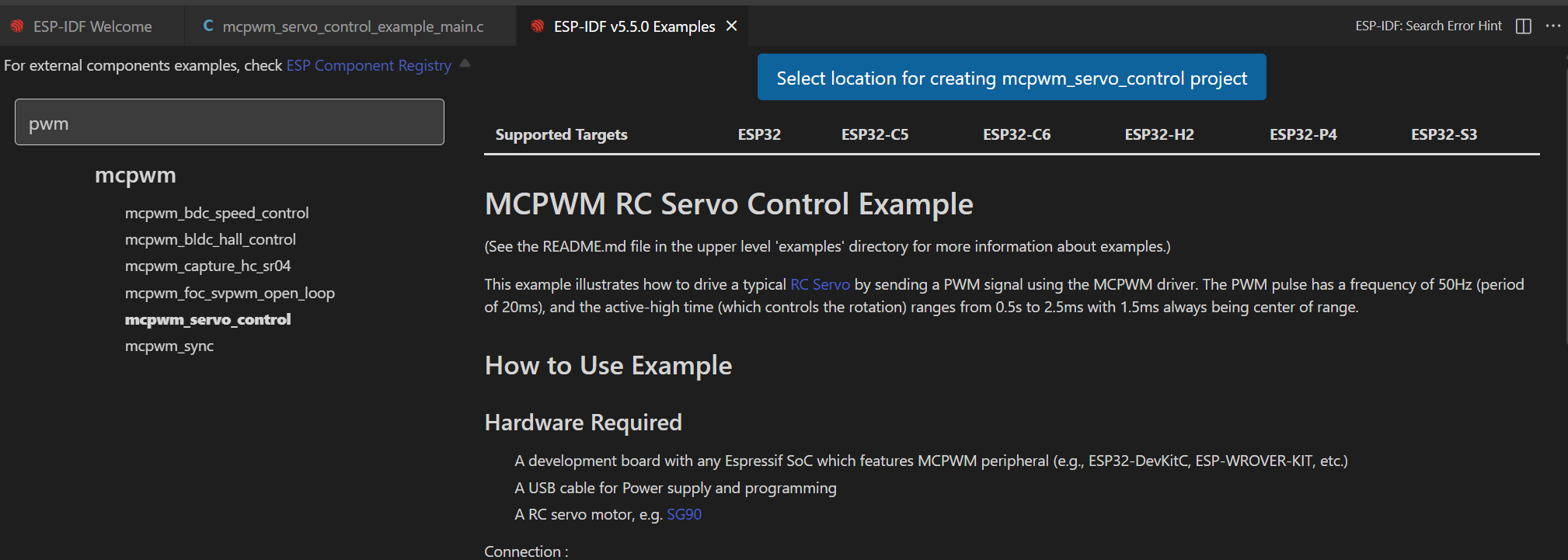 以ESP-IDF v5.5.0的MCPWM RC Servo Control Example进行实践。
