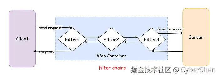 应用中,可以开发编写多个过滤器,这些过滤器组合称为过滤器链。用户发起请求后,请求信息会按过滤器链中过滤器的顺序依次进入每个过滤器。经过每层过滤器时,需通过过滤器的校验逻辑并放行才能进入下一层过滤器,直至服务器获取资源。服务器成功获取资源并响应过滤器后,会按反向顺序经过层层过滤器,最终响应用户。