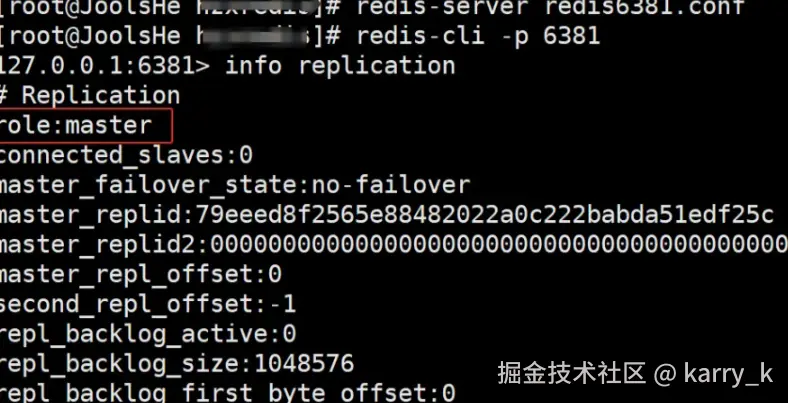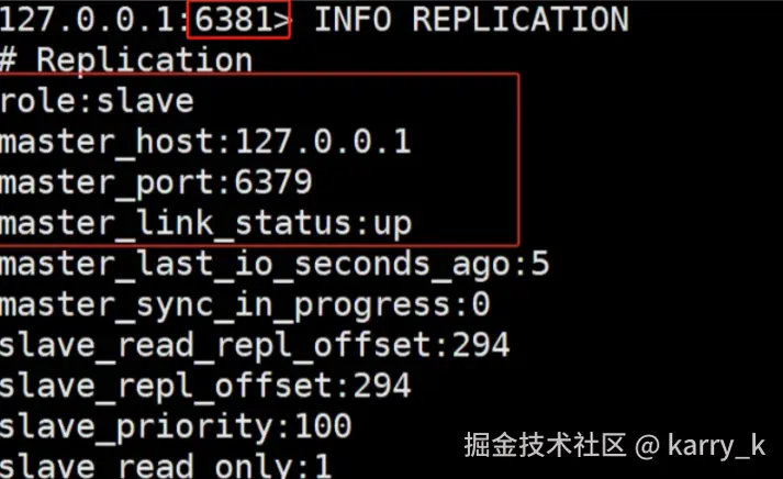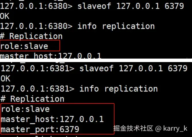 将 6380 和 6381 配置成为 Slave ; 而 6379 作为主机 Master 借助如下指令,配置某个实例的从服务器