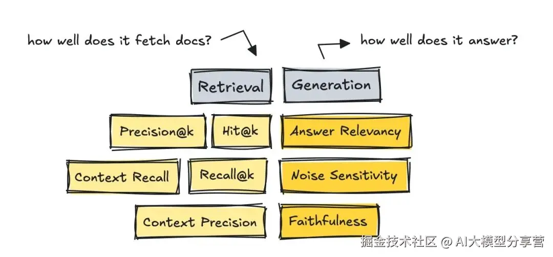 评估 RAG 系统时,需将流程拆分为两部分:分别衡量检索(Retrieval)和生成(Generation)的指标。
