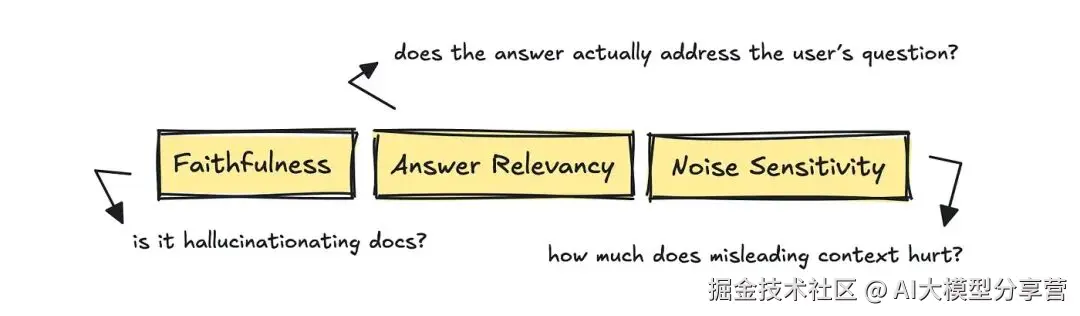评估生成环节时,RAGAS 框架的指标很实用,包括 Answer Relevancy(答案相关性)、Faithfulness(忠诚度)和 Noise Sensitivity(噪声敏感度)。