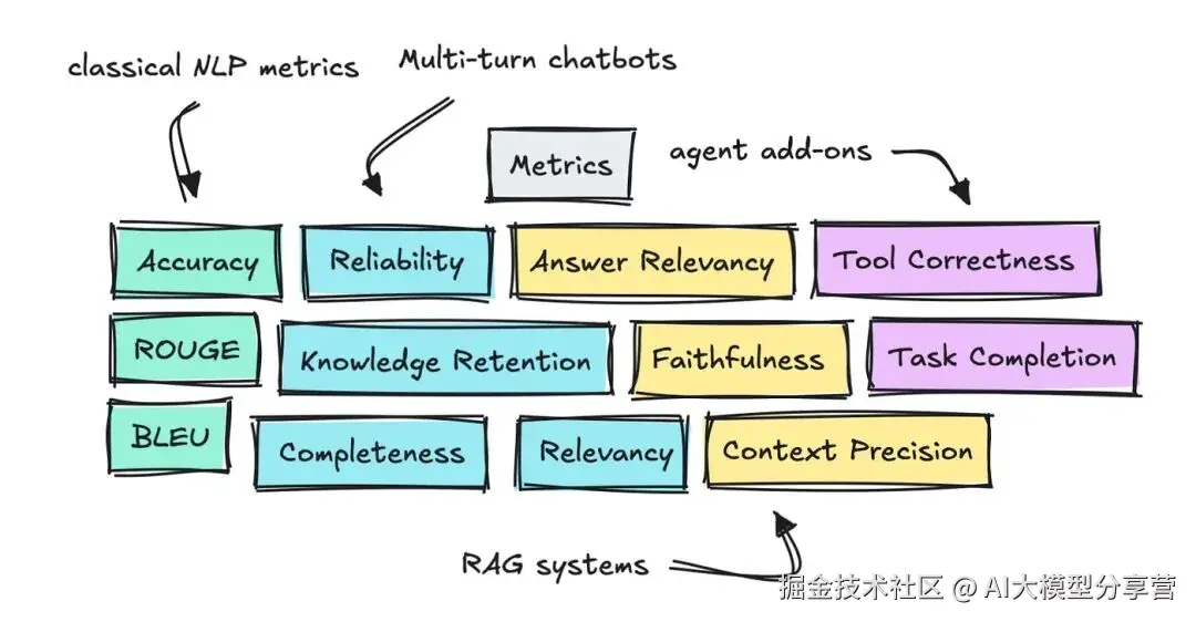 要是不熟悉,建议先了解准确率(Accuracy)、BLEU 等早期指标的用途和原理,以及 MMLU 这类公开基准测试的流程。