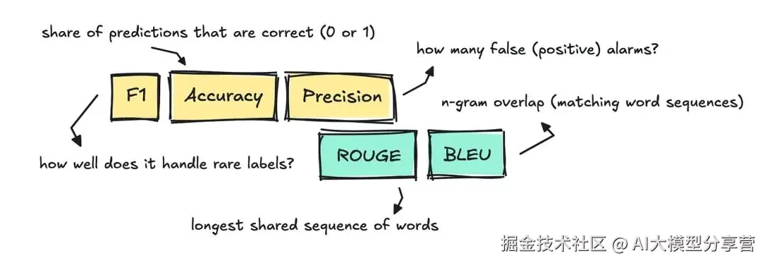 评估文本分类、翻译、摘要等传统 NLP 任务时,我们会用到准确率、精确率(Precision)、F1 分数、BLEU 和 ROUGE 等传统指标。