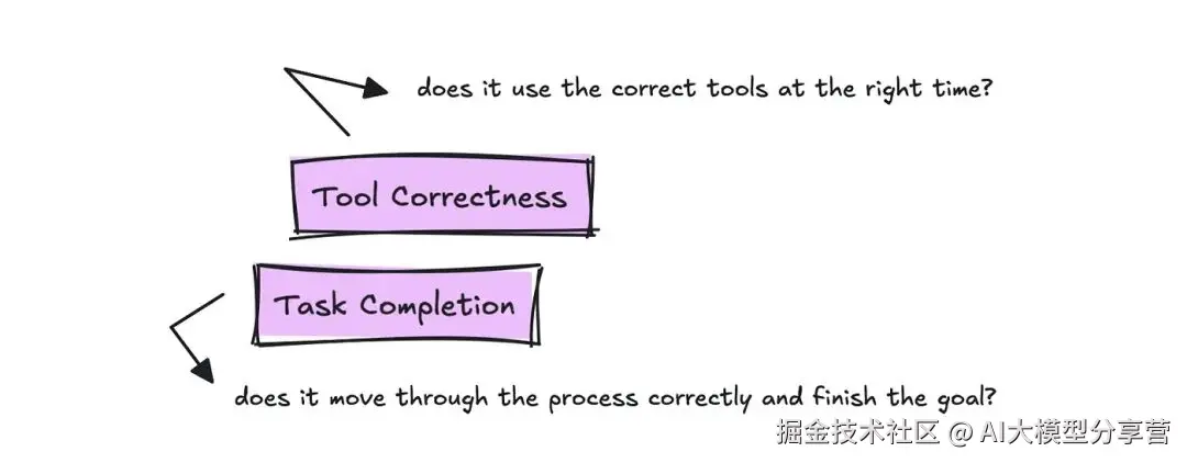 不同框架对这些指标的命名可能不同,但核心要跟踪的两个指标是 Task Completion(任务完成度)和 Tool Correctness(工具正确性)。