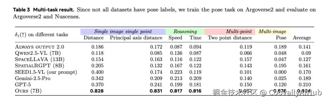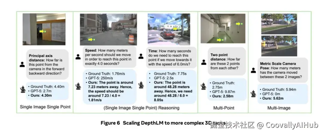 此外,DepthLM还扩展到五类典型三维任务(如速度、时间、相机姿态估计等),同样表现出卓越的泛化能力。研究团队同步推出了一个名为DepthLMBench的综合基准,用于系统评估VLM的三维能力。