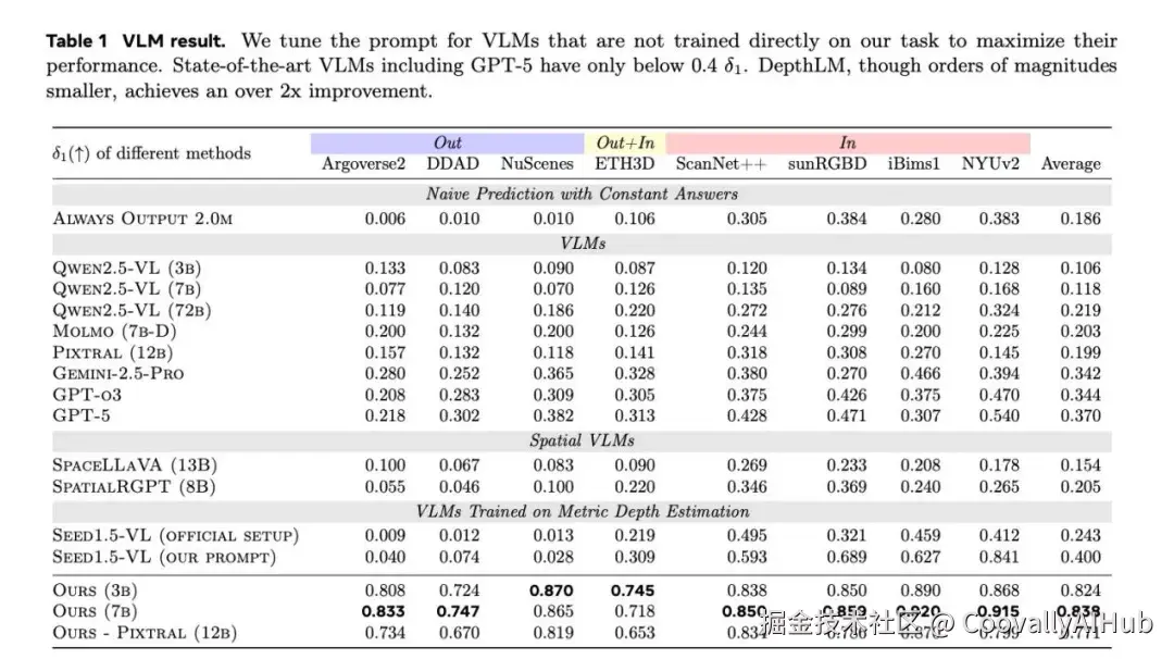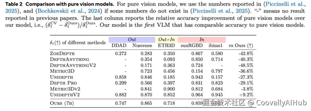 实验结果显示,DepthLM在多个标准数据集上的绝对深度估计任务中,达到了与专门训练的纯视觉模型相当的精度水平,在某些指标上甚至表现出优势。