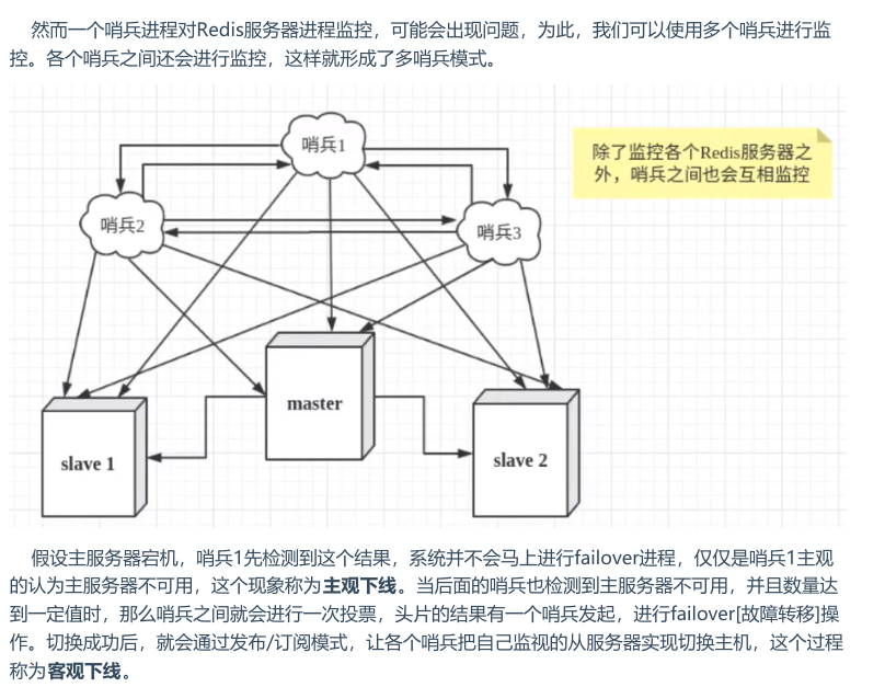 多哨兵模式:(哨兵互相监控,主管下线后投票实现客观下线 )