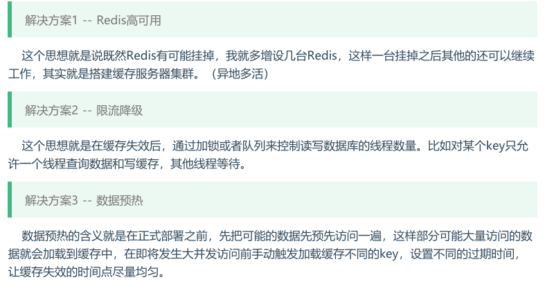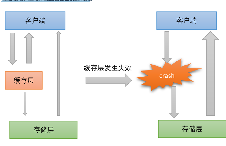 比如:在写文本的时候,马上要到双十一零点,很快就会迎来一波抢购,这波商品时间比较集中的放入了缓存,假设缓存一个小时。那么到了凌晨一点钟的时候,这批商品的缓存就过期了。从而对这批商品的访问查询,都落到了后台数据库上,对于数据库而言,就会产生周期性的压力波峰。于是所有的请求都会达到存储层,存储层的调用量会暴增,造成存储层也会宕机的情况