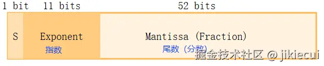 - Exponent: 11位,用于存储科学计数法中的指数。