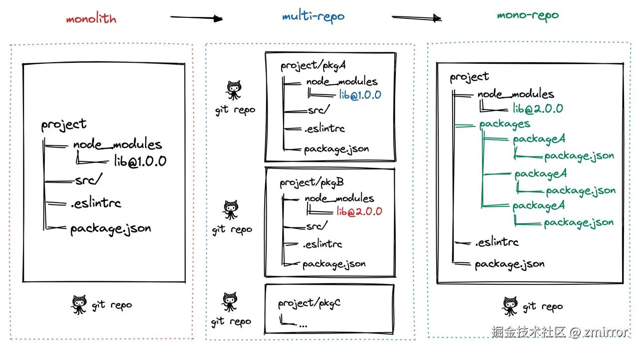 仓就是仓库(repository,简称 repo),通常我们使用多个仓库(简称多仓,multi-repo)来管理项目代码,也就是每个仓库负责一个模块或包的编码、构建、测试和发布,代码规模相对较小,所以也称为小型规模仓库(简称小仓)。而单一(mono)仓库(简称单仓,mono-repo)是指在一个仓库中管理多个模块或包,当代码规模达到一定程度后可称为大型规模仓库(简称大仓)。