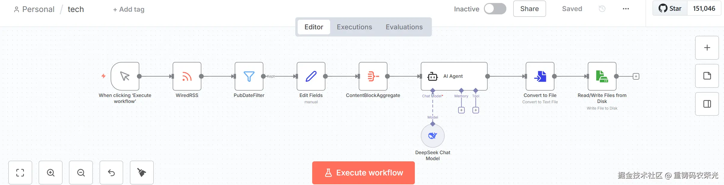 我们先拆解上图中 n8n 工作流的核心节点,看看每一步是如何为 "自动化生成科技新闻速览" 服务的。