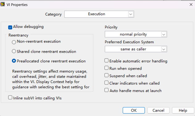 从技术本质看,普通子 VI 在被调用时共享单一内存映像,多线程调用需排队等待释放,而可重入子 VI 通过动态分配独立内存块,实现了真正的并行执行。其实现依赖 LabVIEW 的执行系统调度,当设置为 "预分配副本" 时,系统会预先创建固定数量的实例副本;设置为 "每次调用分配" 时,则在调用时动态生成实例,调用结束后释放资源。