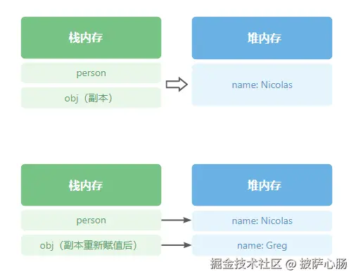 对于简单数据类型,"值传递"传递的就是变量值;而对于引用数据类型,可以认为"值传递"传递的是变量的内存地址值,也就是说创建了一个引用类型的变量的地址的副本 ,函数内外的变量指向同一个对象,这时在函数内部修改对象值,外部变量值自然也会改变。但是如果在函数内部对变量重新赋值,相当于把内部变量的值指向了一个新的地址,这时再修改内部对象值,自然不会影响到外部变量值。