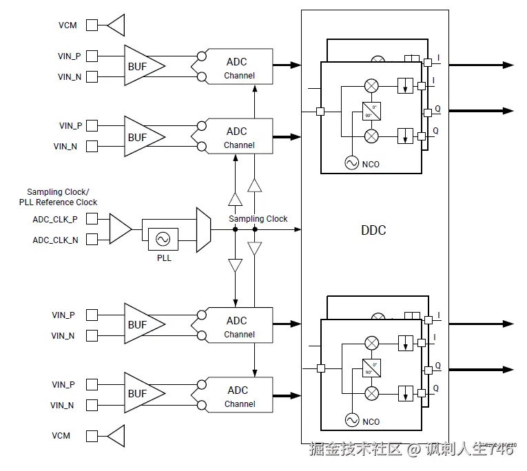 模块组成有ADC子系统,包含模拟采样 + DDC(数字下变频) + 抽取滤波的功能