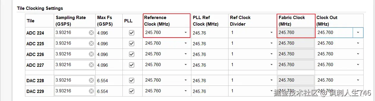 Reference clk:是每个PLL的输入时钟,频率需要与Fabric clk,m_axis_aclk的频率一致,他的值取决于采样率的大小,在配置界面更改采样率的时候reference clk也会变,大小通常为MHz级别,是生成采样时钟的参考时钟