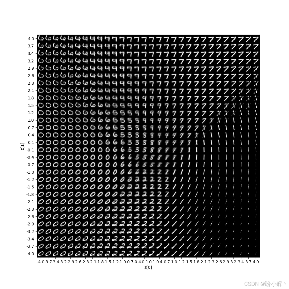 训练后,下图展示了在连续潜空间中遍历时数字的分布情况。例如从中心区域向右移动时,数字会从 2