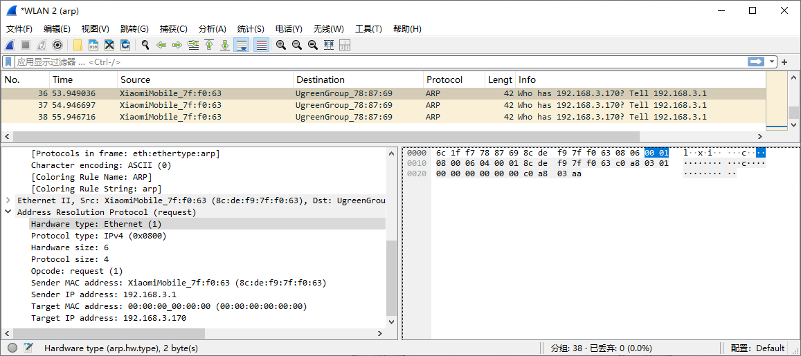 打开Wireshark,选择一个网络(我这里是WLAN2),在过滤器输入框中输入arp,然后回车,wireshark就会自动过滤出ARP协议的数据。