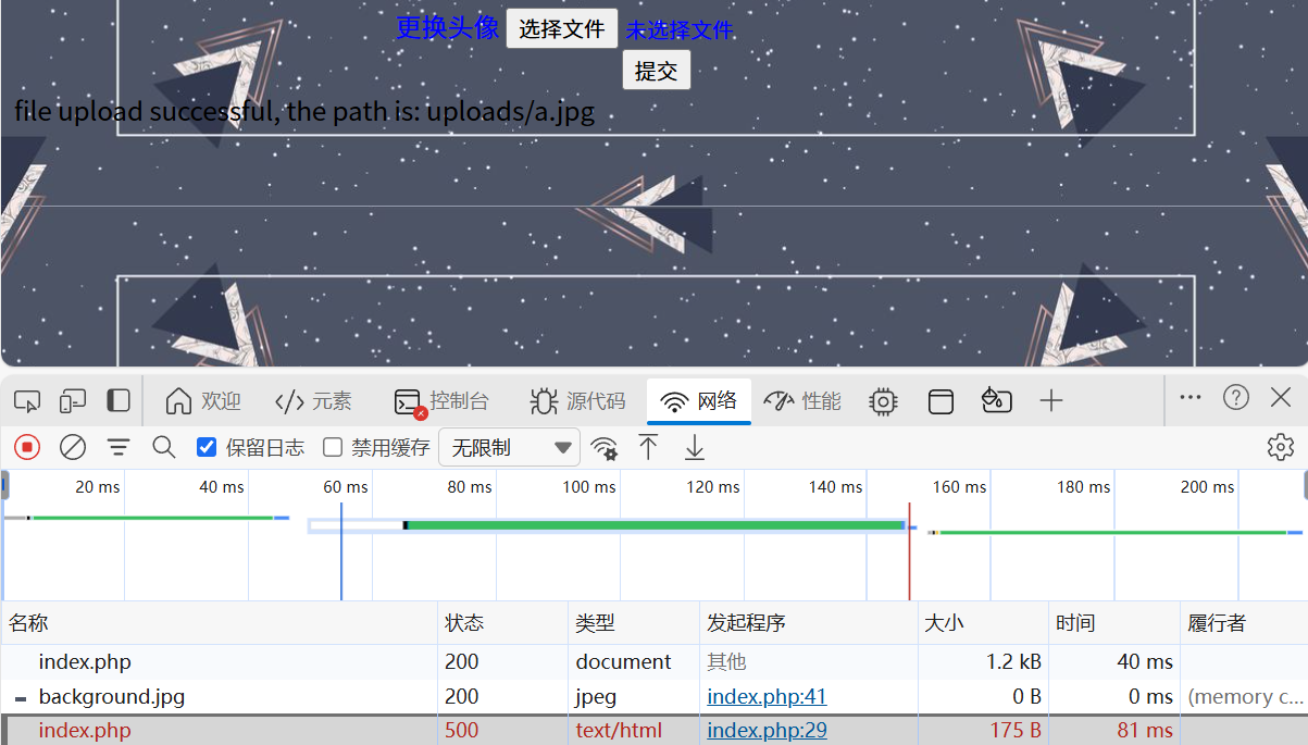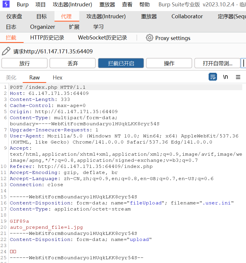 4.发包,在浏览器上传一个带有一句话木马的1.jpg文件发现上传成功
