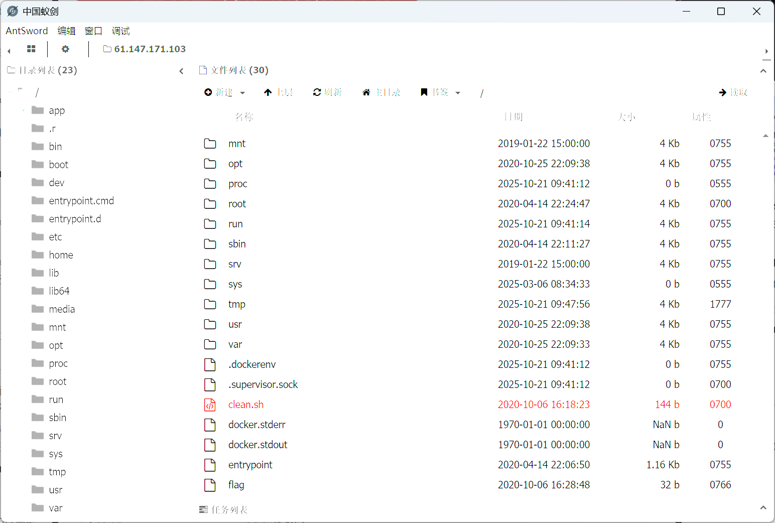 6.将url粘贴进蚁剑,并连接,在文件目录的最下方有flag文件