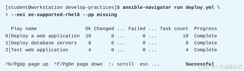 [student@workstation develop-review]$ ansible-navigator run site.yml --eei ee-supported-rhel8 --pp missing -m stdout