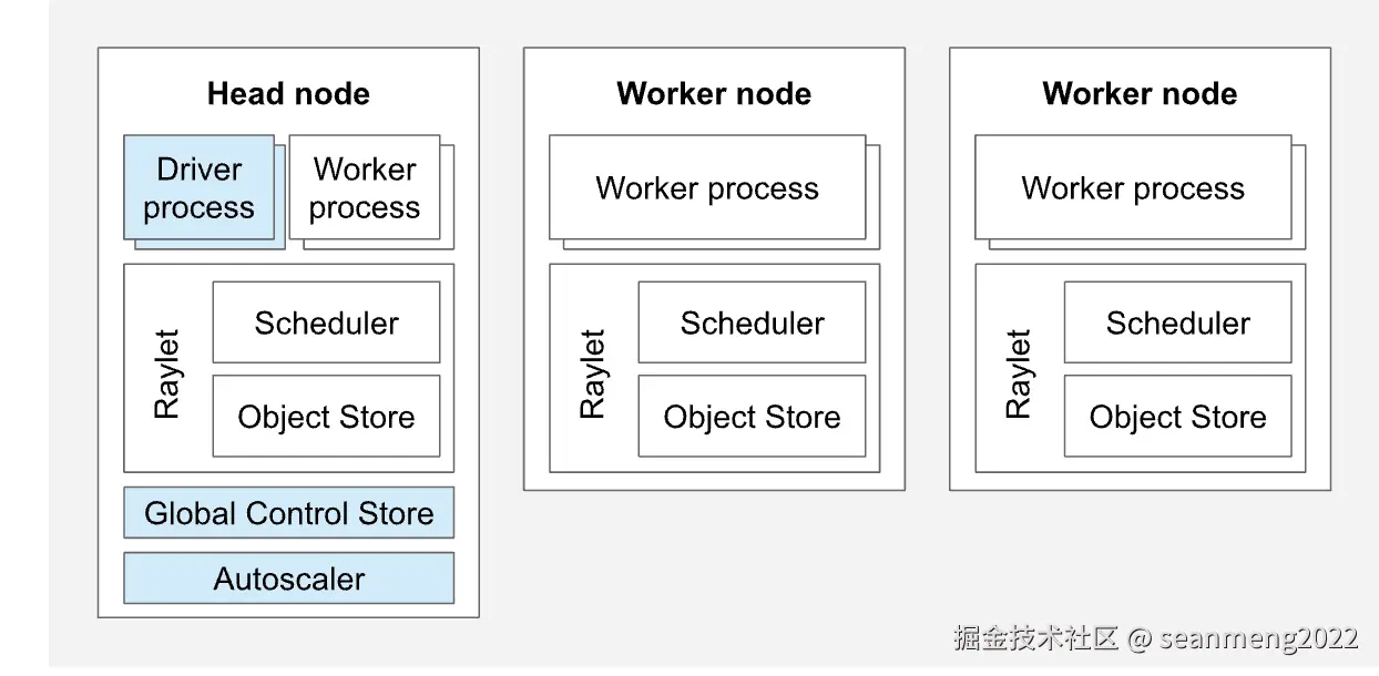 每个 Ray 集群都有一个节点被指定为集群的头节点。头节点与其他工作节点相同,不同之处在于它还运行负责集群管理的单例进程,例如自动缩放器、GCS 以及运行 Ray 作业的 Ray 驱动程序进程。
