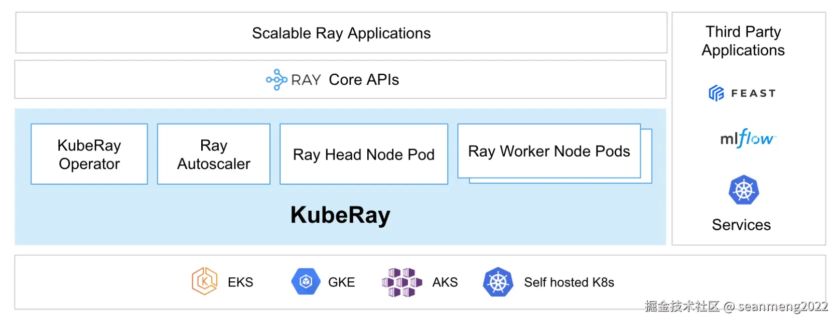 推荐使用 KubeRay Operator 来实现这一点。该 Operator 提供了一种 Kubernetes 原生的方式来管理 Ray 集群。每个 Ray 集群由一个头节点 Pod 和一组工作节点 Pod 组成。可选的自动扩缩支持允许 KubeRay Operator 根据 Ray 工作负载的需求调整 Ray 集群的大小,并根据需要添加和删除 Ray Pod。KubeRay 支持异构计算节点(包括 GPU),并且支持在同一个 Kubernetes 集群中运行多个使用不同 Ray 版本的 Ray 集群。