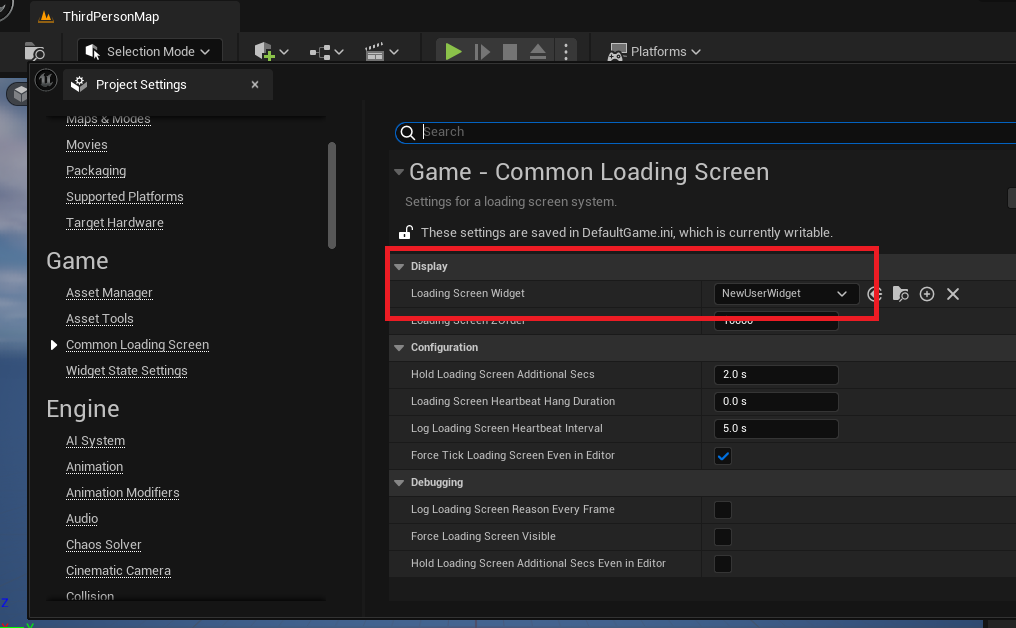 3.在Project Settings下找到Common Loading Screen的设置,新建一用于加载的Widget设置到LoadingScreenWidget处