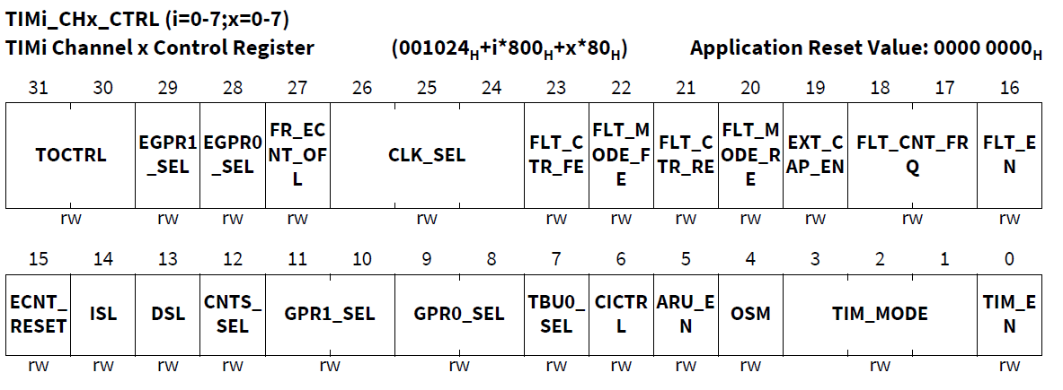 **bit14:**ISL,TIEM模式下选择双沿还是上升沿或下降沿。如为0B,单沿采集(上升还是下降沿由DSL决定);如为1B,双沿采集,此时忽略DSL的设置。
