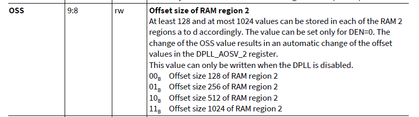 GTM_DPLL_OSW.B.OSS = 0; /* 配置RAM2储存值数量为128,以上存储值数量是116个,足够. */