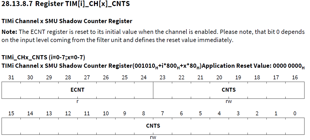 **bit12:**CNTS_SEL,选择影子寄存器CNTS。可来源于:TBU_TS0或SMU的CNT寄存器