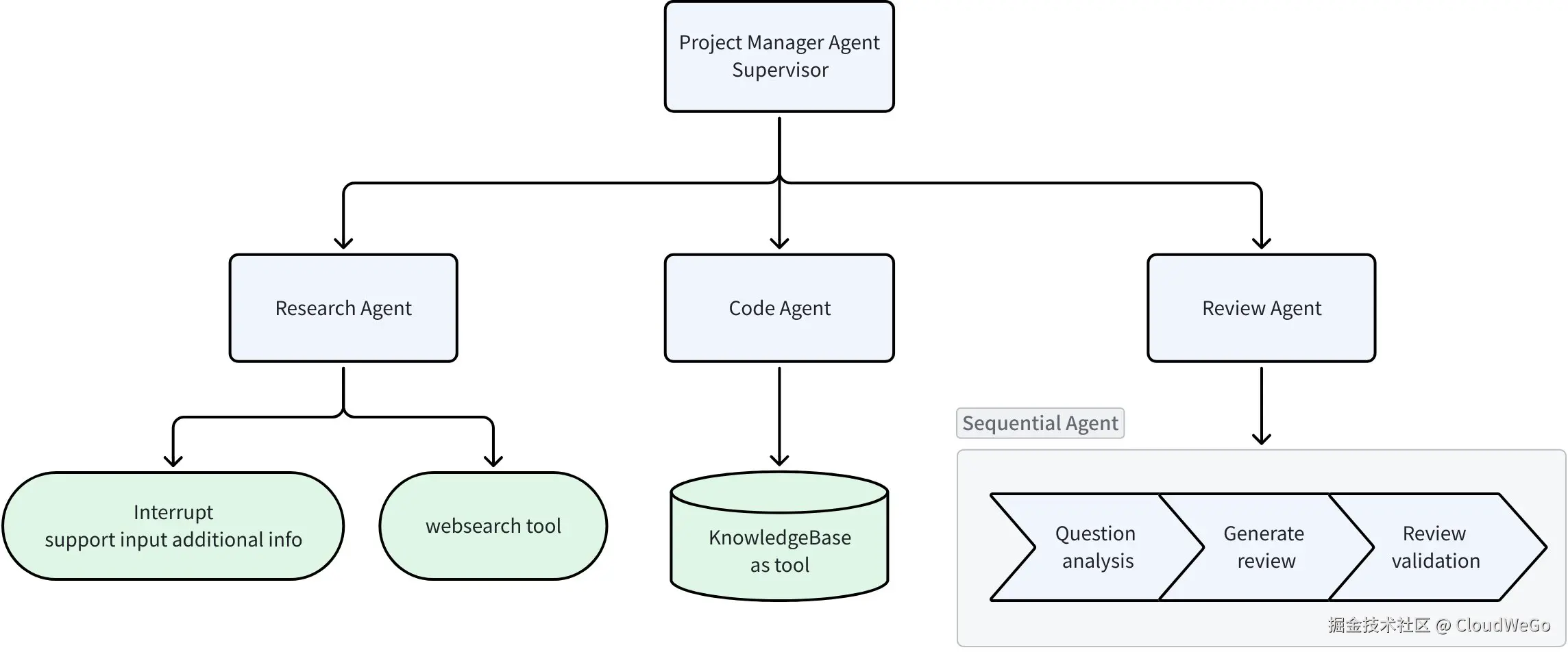 - Project Manager Agent:项目经理智能体,整体使用 Supervisor 模式,各 Agent 的功能如下: