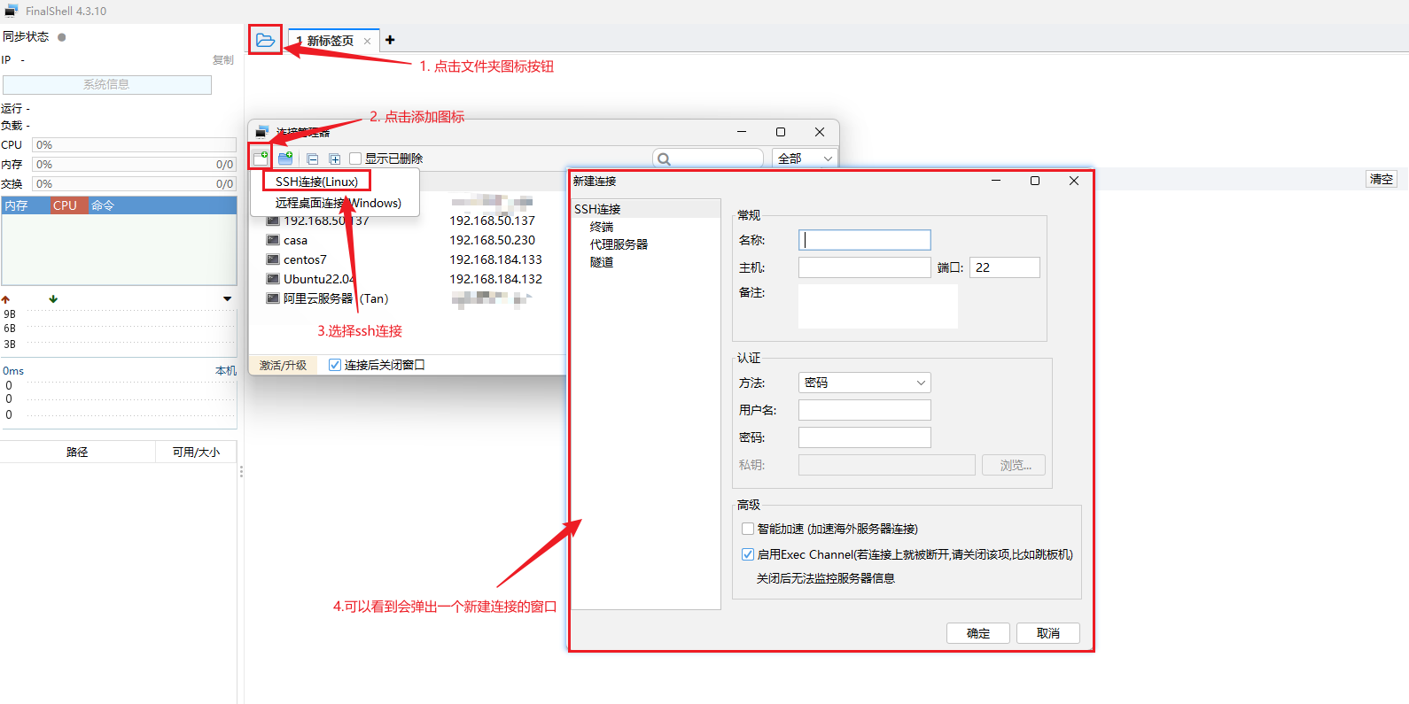 接着需要解压【finalshell】工具,解压后直接在解压目录中双击【finalshell.exe】程序即可打开它,打开后,如下图操作: