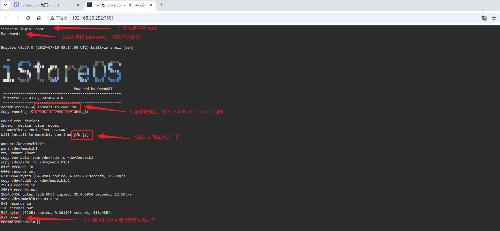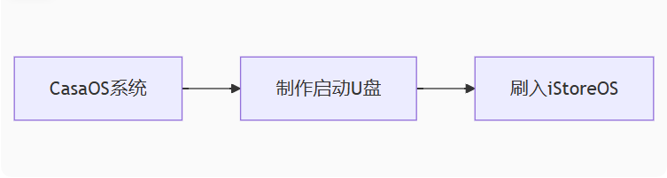 Linux系统互刷: 基于Linux的系统之间可以相互刷入,通过烧录镜像写入U盘,然后U盘启动系统,并将系统写入eMMC存储中。在开始编写本教程前,已经成功从CasaOS系统刷入到了iStoreOS系统: