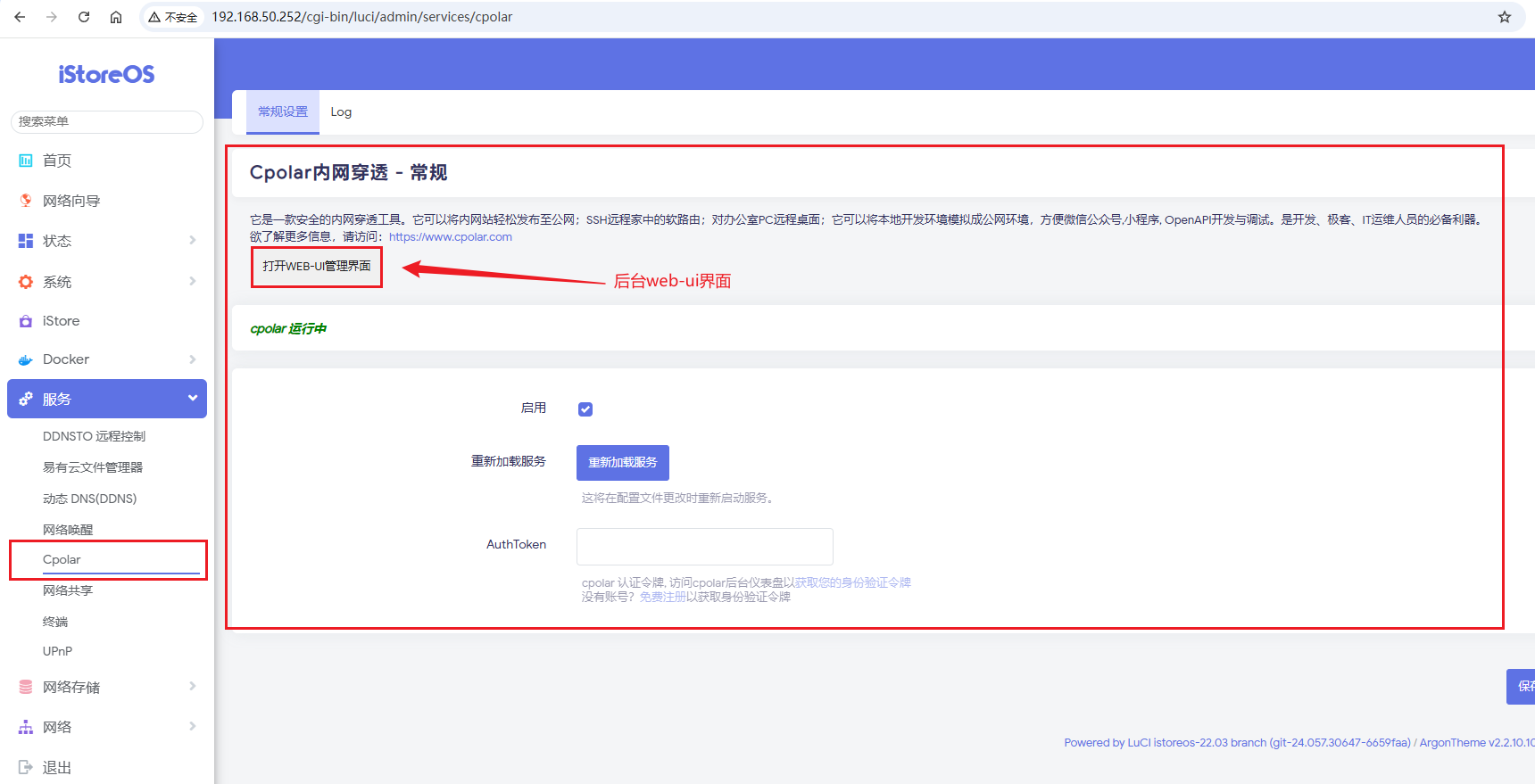 执行完成后,直接刷新iStoreOS首页,然后点击【服务】,展开即可看到Cpolar菜单: