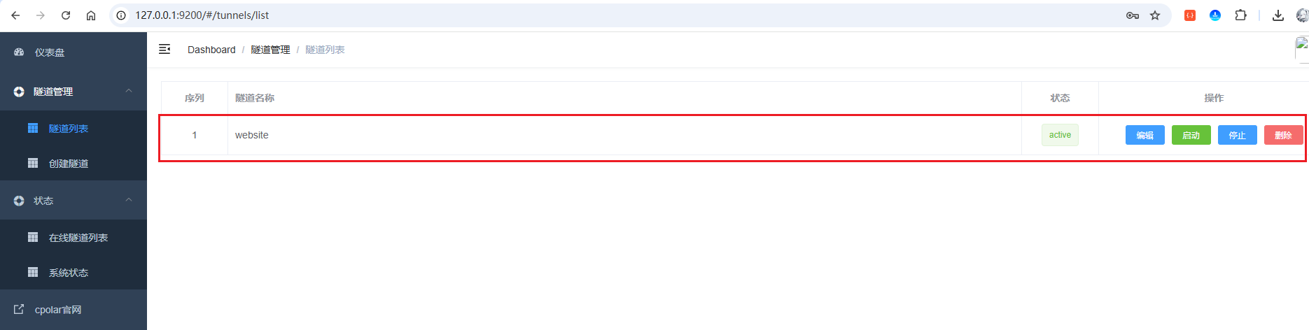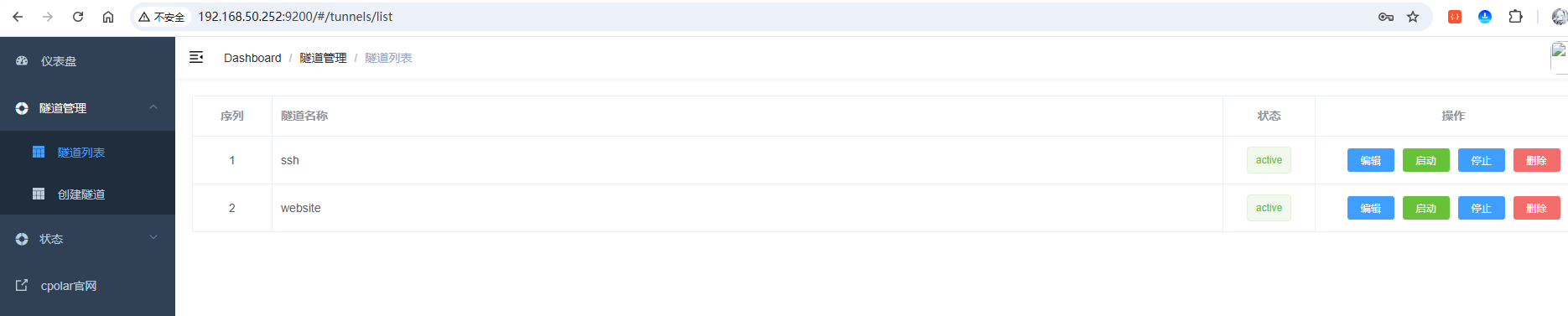 注册好账号以后,回到该页面进行登录即可,登录成功后,进入侧边的【隧道管理>隧道列表】,可以看到有2条隧道: