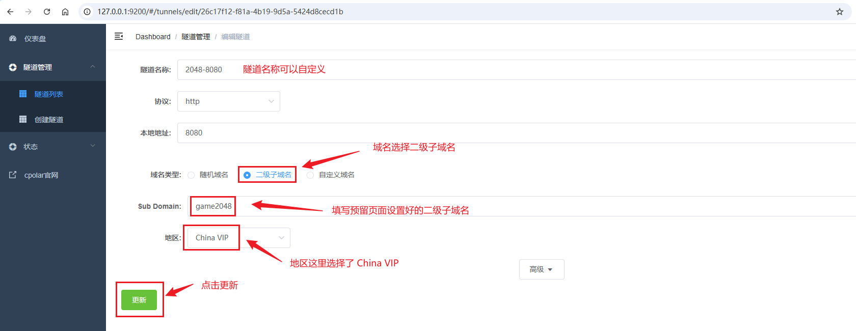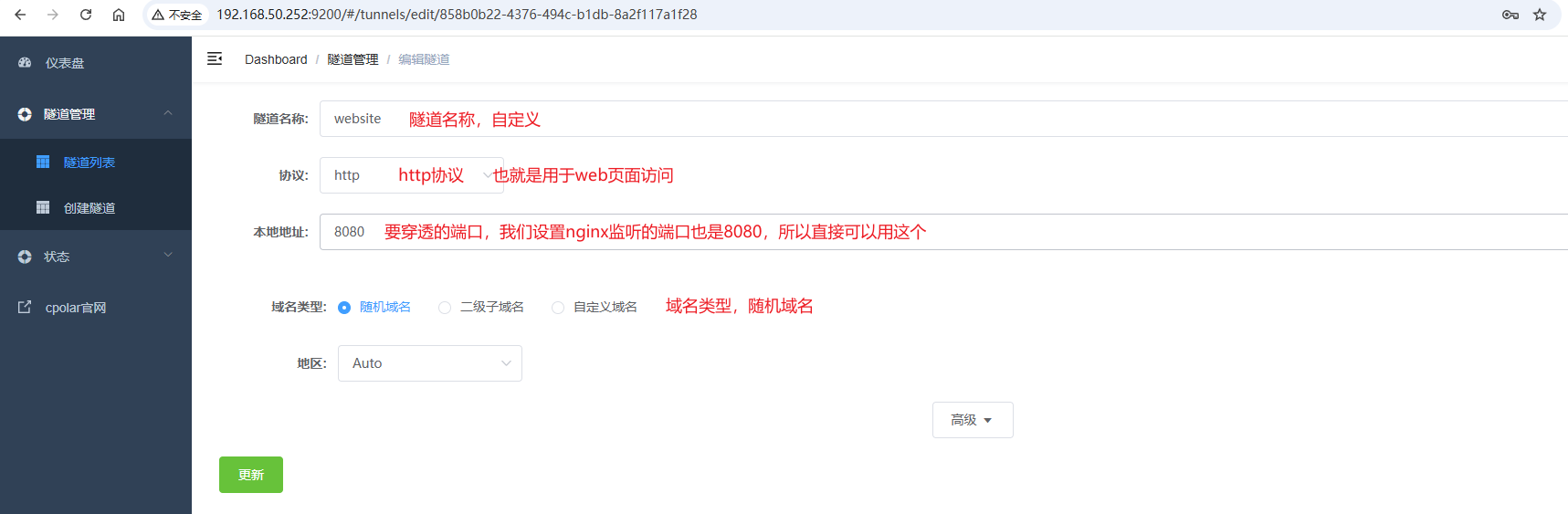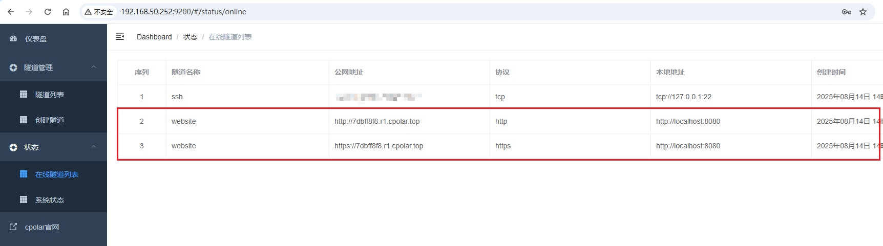 可以看到端口正好是8080,就不用额外创建隧道了,接下来直接点击【状态>在线隧道列表】查看公网访问地址: