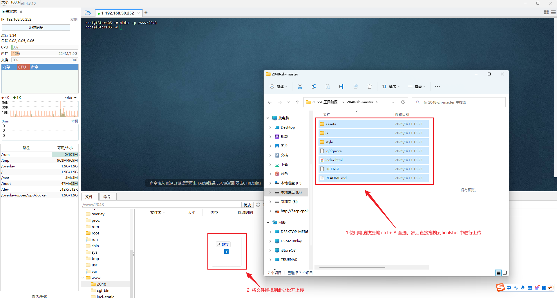 接着打开电脑上的2048小游戏源码目录,把全面内容复制拖动到finalshell 该窗口位置: