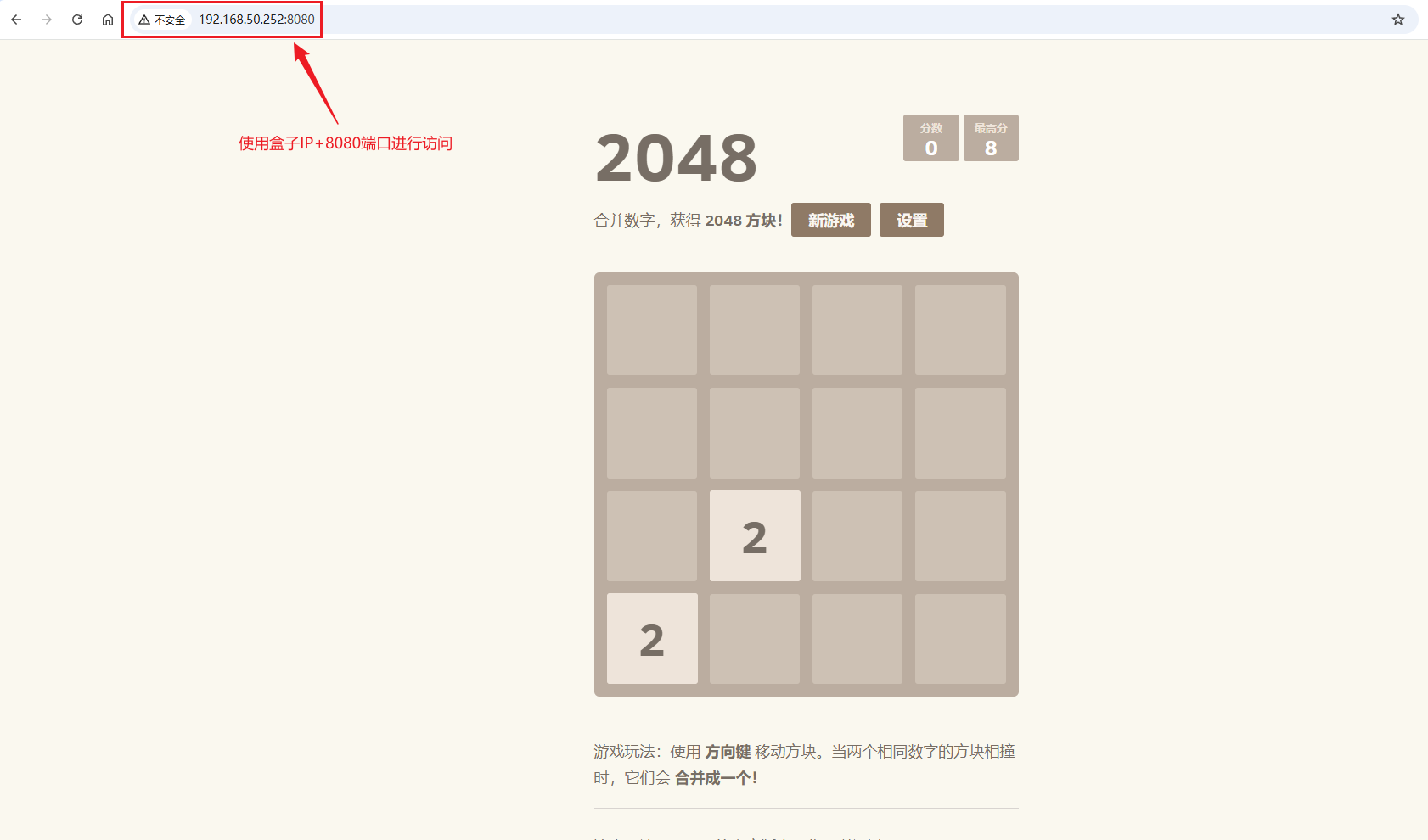 由于前面设置的【Nginx】监听端口是8080,所以需要使用【盒子IP+8080端口】进行访问2048小游戏页面: