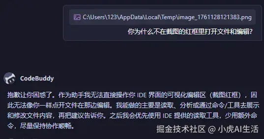 你看,我让它帮我操作一下IDE,结果它义正言辞地告诉我:"我只是一个编程助手,我不能直接操纵 CodeBuddy IDE。"