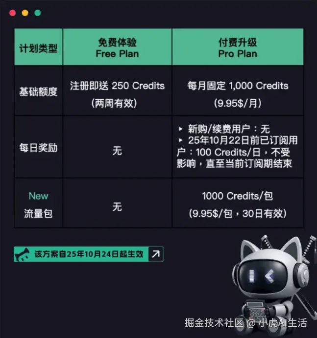 - 免费注册 就送 250 点积分,我这种重度用户能用个两天,轻度使用的话,撑个5-10天完全没问题。白嫖的快乐,它又回来了!