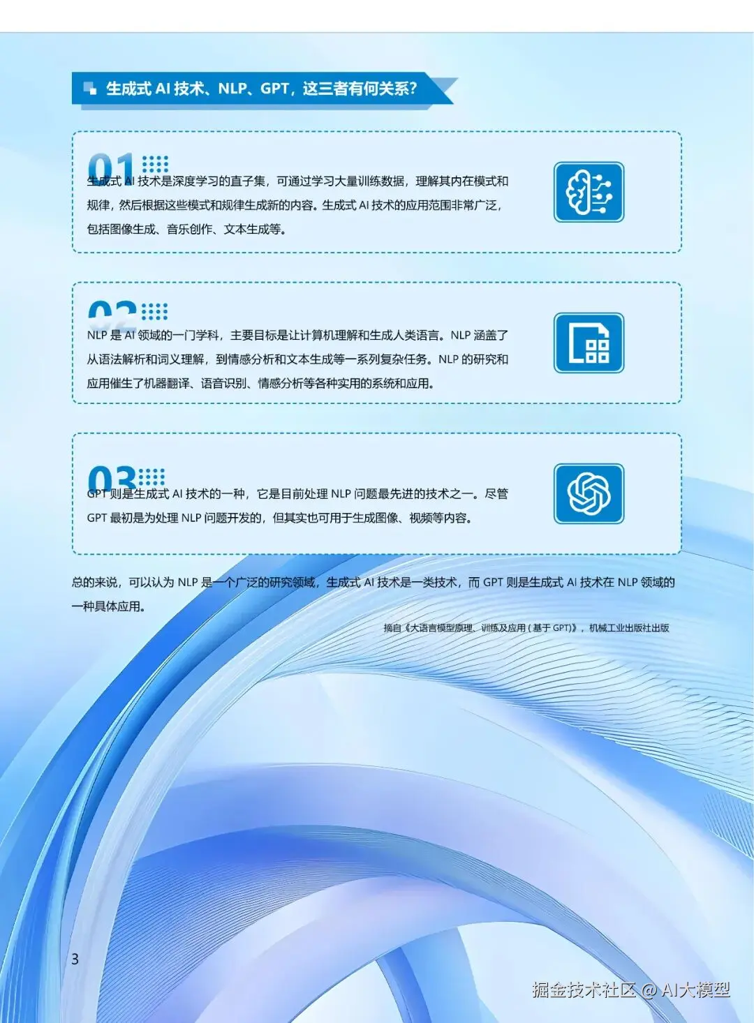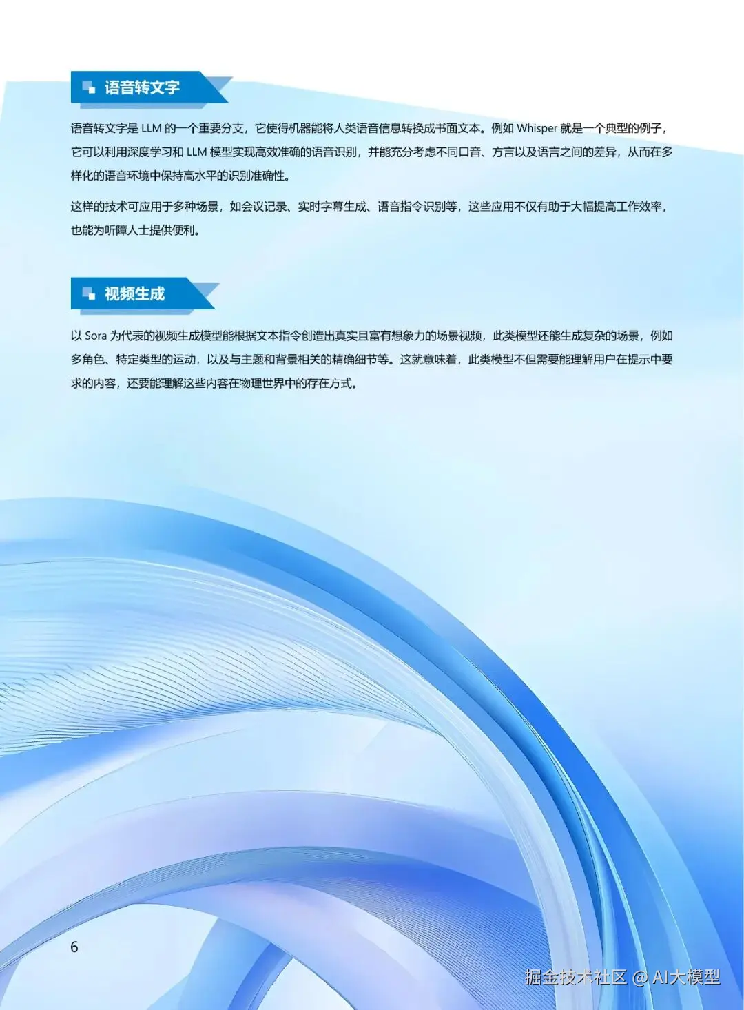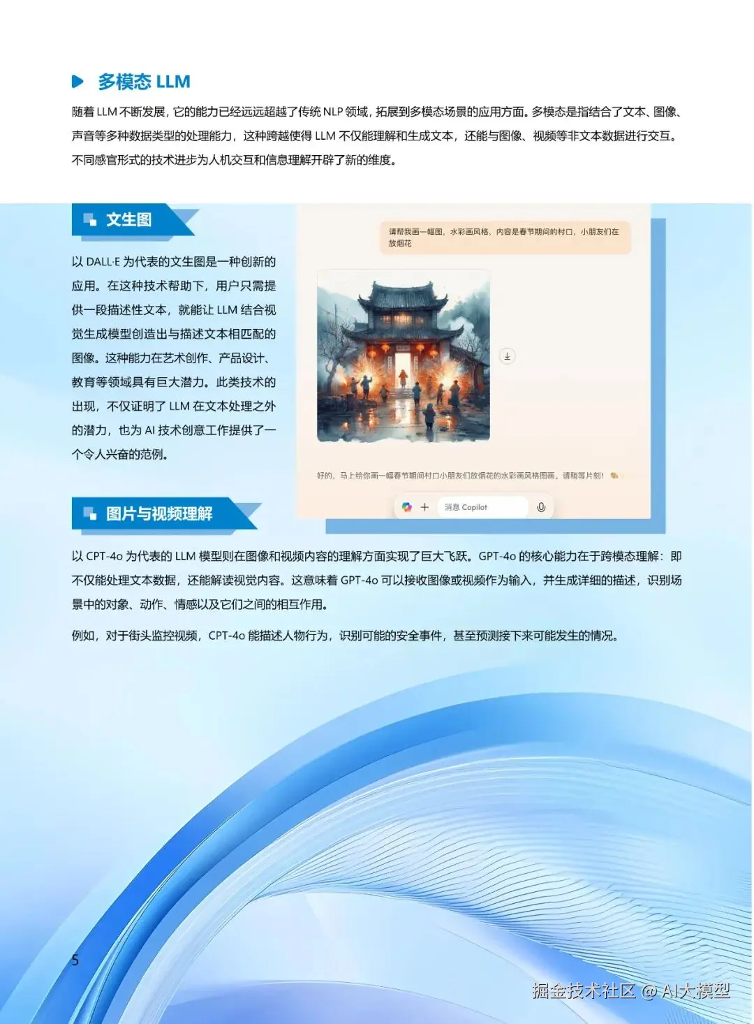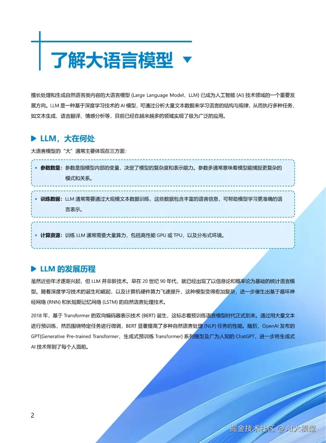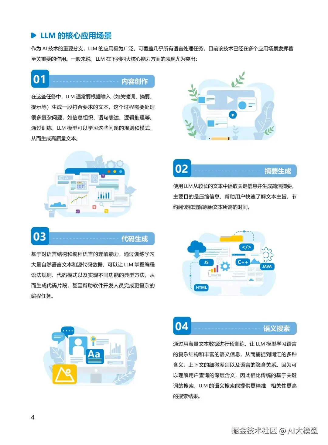 - 了解大语言模型:LLM的"大"体现在参数数量多、需大量训练数据和计算资源。其发展历经统计语言模型、基于RNN和LSTM的技术,至2018年BERT诞生进入预训练语言模型时代。LLM核心应用于内容创作、摘要生成、代码生成和语义搜索,多模态LLM还能实现文生图、图片与视频理解、视频生成等功能 。