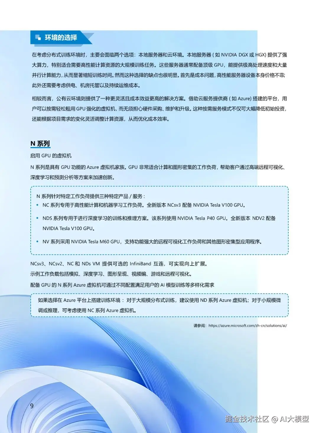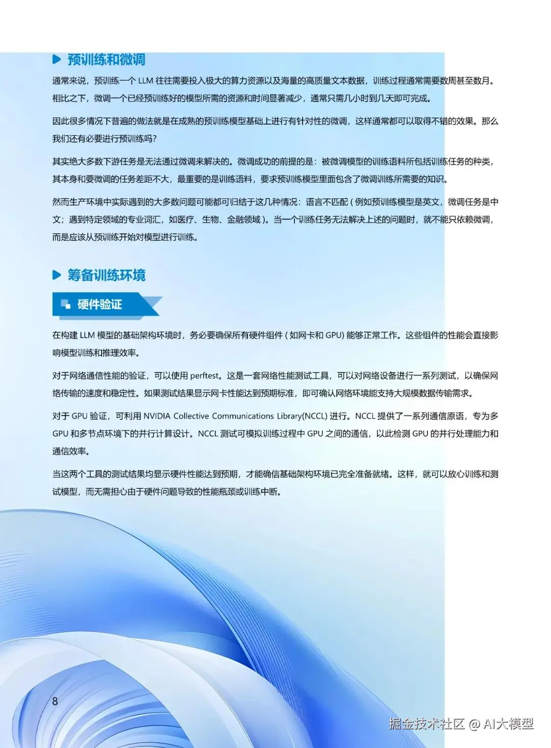 - 训练大语言模型:Transformer网络架构包含Encoder和Decoder,由Embedding、多头注意力层等模块组成,解决了RNN的局限。训练LLM有预训练和微调两种方式,预训练需大量资源,微调基于预训练模型,二者适用不同任务场景。训练前要验证硬件性能,可选择本地服务器或云环境,如Azure的N系列虚拟机 。