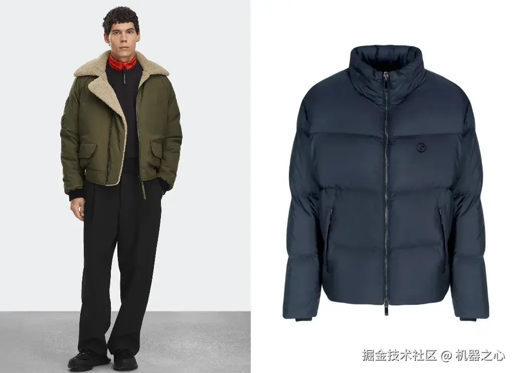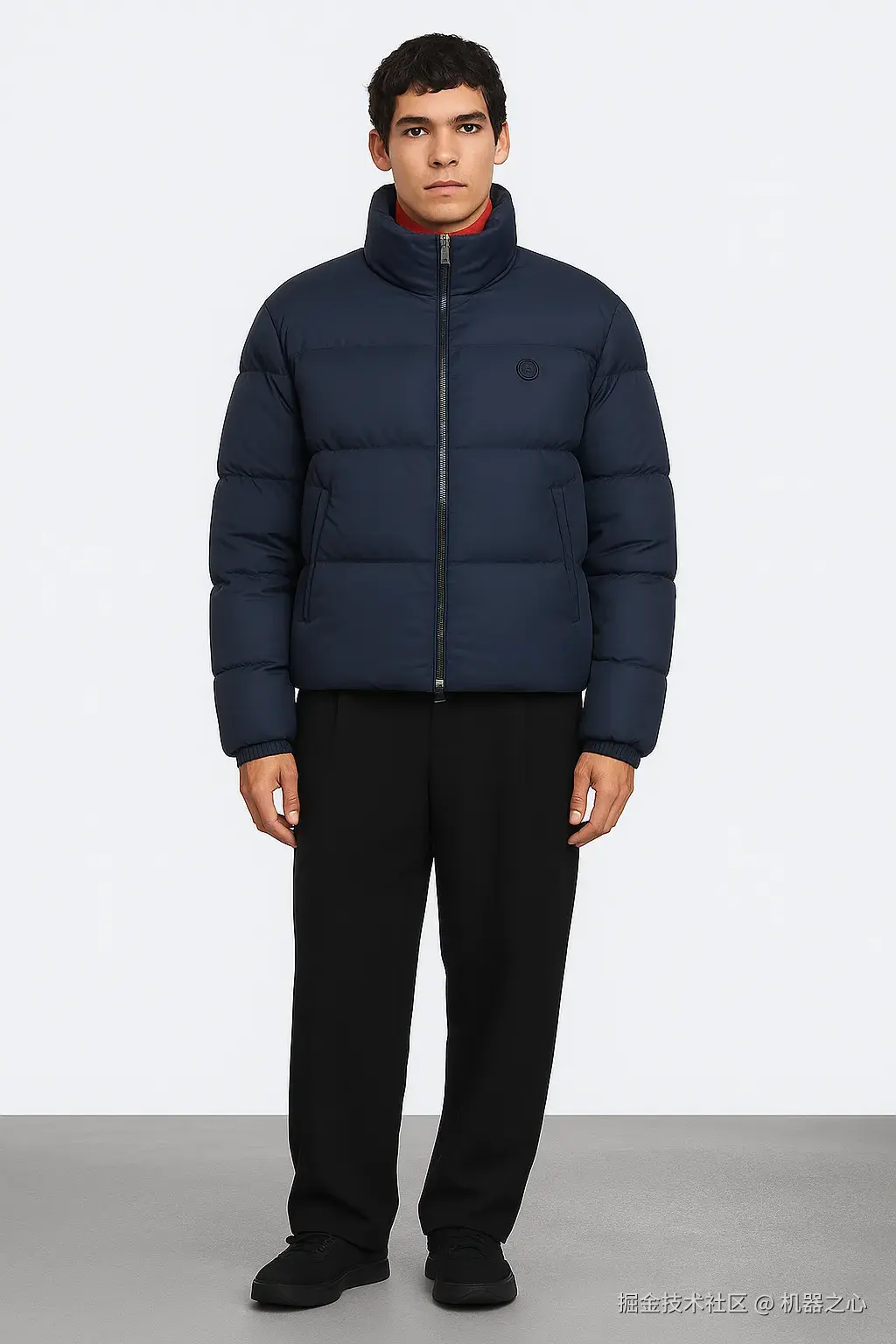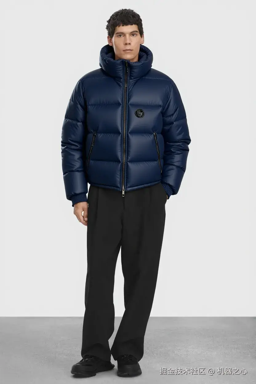 输入如下两张图,提示为「将第一幅图中的夹克替换为第二幅图中的衣服(Replace the jacket in the first image with the clothes in the second image)」。