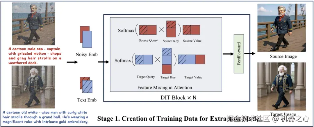 第一阶段采用特征混合方案,通过双分支结构同时生成源图像与目标图像。并且利用基础模型的 T2I(文本到图像)能力,创建包含具体物体与抽象属性的高质量数据对。与 UNO 采用的 diptych 数据生成方法相比,特征混合方案表现出了三大优势:不降图像分辨率、不会出现因分割线偏移而导致的内容混叠、数据质量与准确性更高。