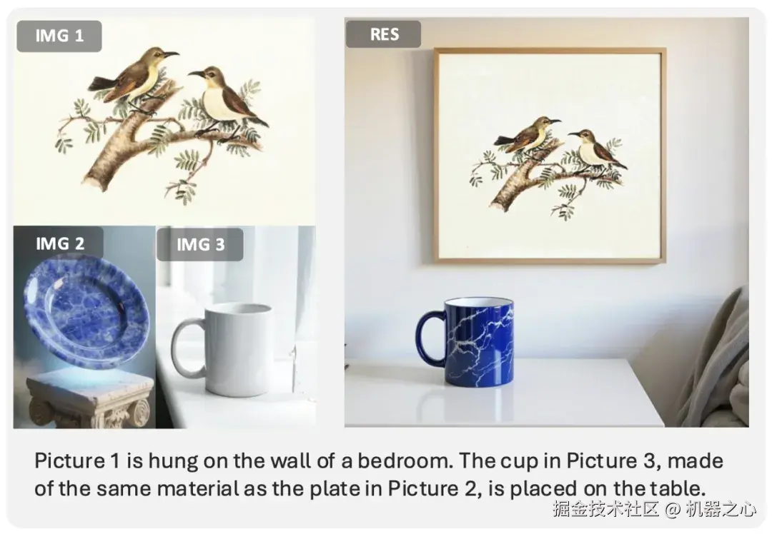 基于指令的图像生成:图 1 被挂在卧室的墙上,图 3 中的杯子变成与图 2 中盘子相同的材质,并被放置在桌子上。
