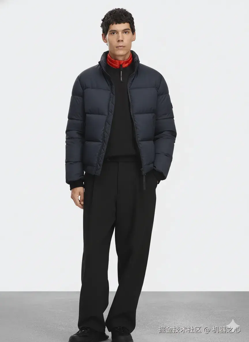 随后,我们又测试了谷歌 Nano Banana,人物的姿态与五官保持完好,衣物替换后的整体视觉效果自然协调,但衣物颜色和形态发生了变化,logo 也消失了。