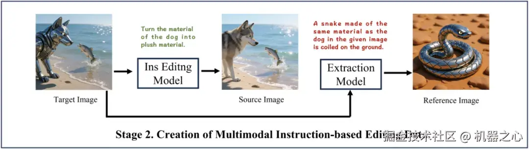 第二阶段聚焦于构建基于指令的多模态编辑数据。首先利用 T2I 模型生成的图像和真实图像来创建目标图像;随后利用第一阶段训练得到的特征提取模型来模拟目标图像中的物体或属性,并基于指令生成参考图像;接着使用基于指令的编辑模型修改目标图像中提取的物体或属性,从而创建源图像;最终形成了从参考图像、源图像到目标图像的训练对。