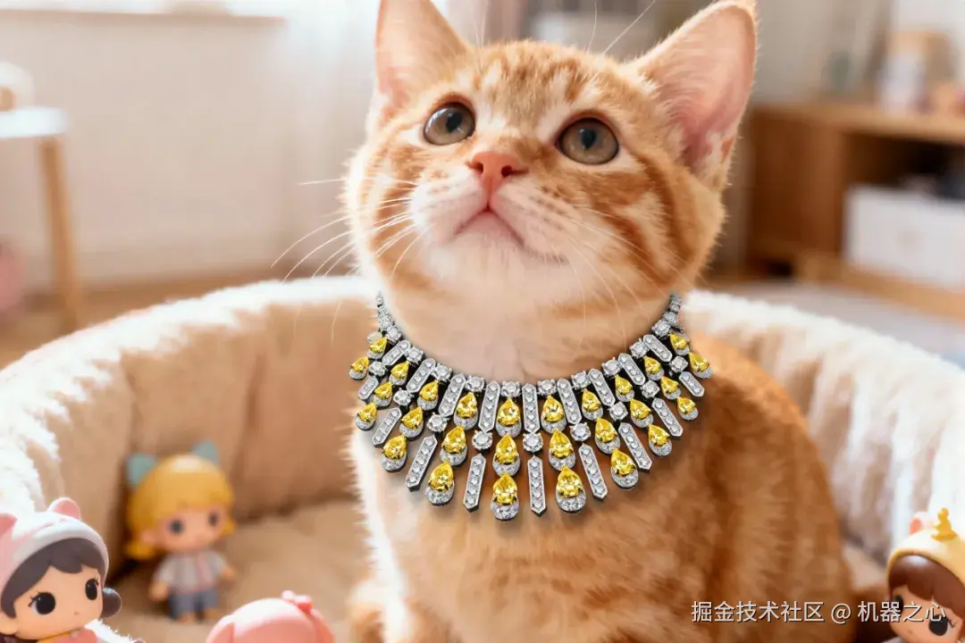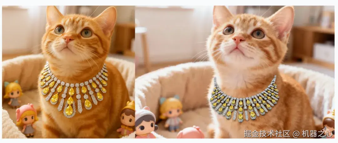 最后,我们同样对 DreamOmni2 与 GPT-4o、Nano Banana 的生成效果进行对比。输入两张图片,要求是「将图 2 的项链戴在图 1 中的猫的脖子上」。