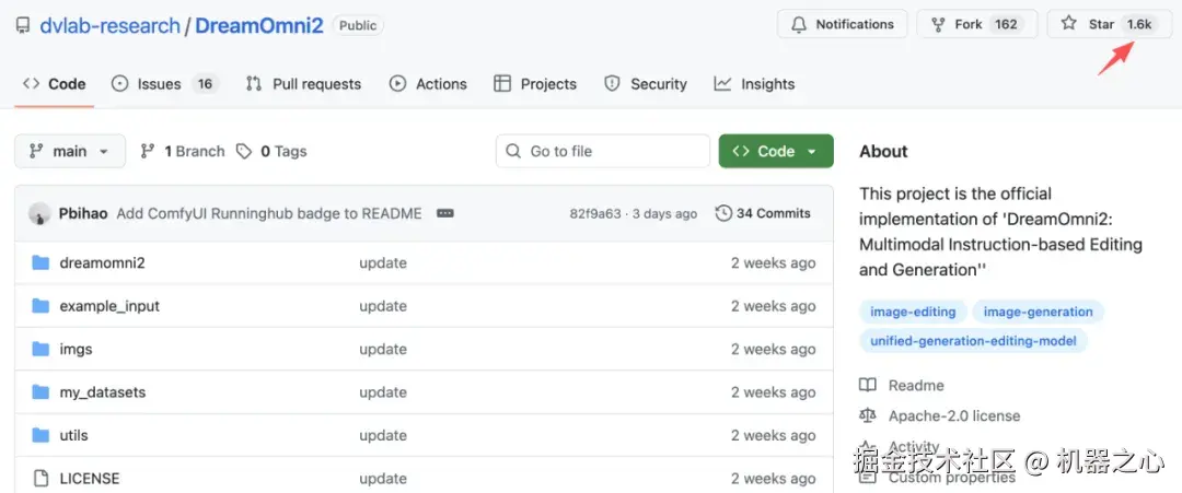 开源两周以来,DreamOmni2 收获了开源社区的大量认可,在 GitHub 上已经积累了 1.6k 的 Star 量。